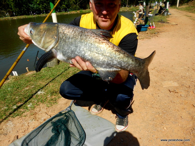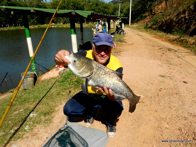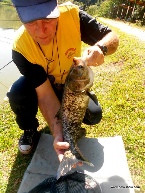O Pescador Wlademir ajustou a altura do nó dos equipamentos para 70 centímetros e desfrutou de sequencia de 3 carpas sendo fisgadas na massa Melo de amendoim com um toque especial de nuvem azul, uma essência a base de pó de sorvete, duas na vara de molinete e outra na vara de mão.